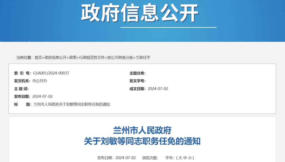 7月2日,兰州市人民政府发布关于刘敏等同志职务任免的通知,建议任命刘敏为兰州银行股份有限公司副行长、董事(享受企业正职待遇)。