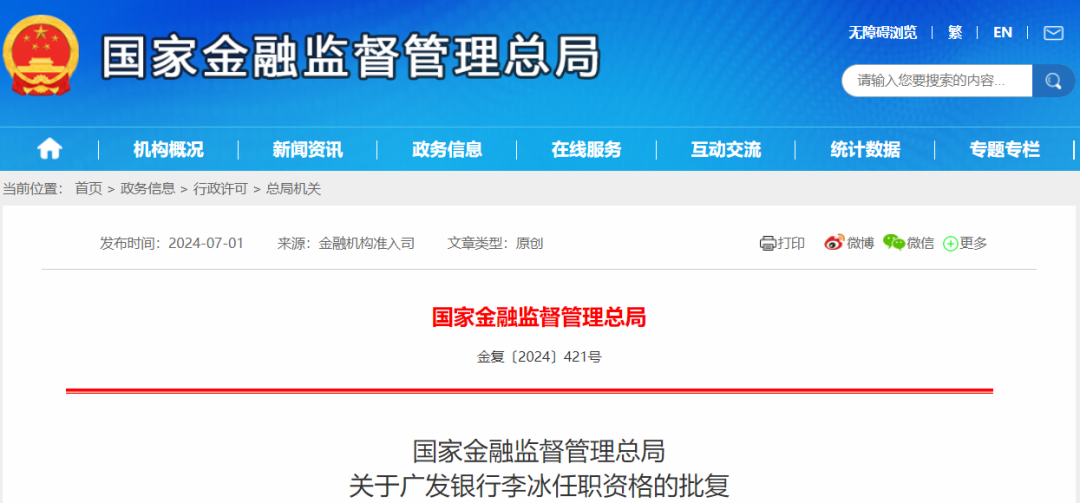 7月1日,金融监管总局网站发布的批复显示,核准李冰广发银行股份有限公司副行长的任职资格。