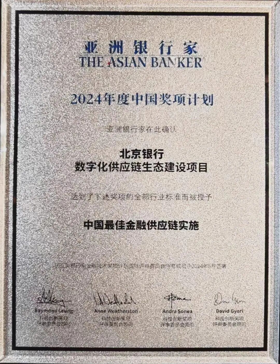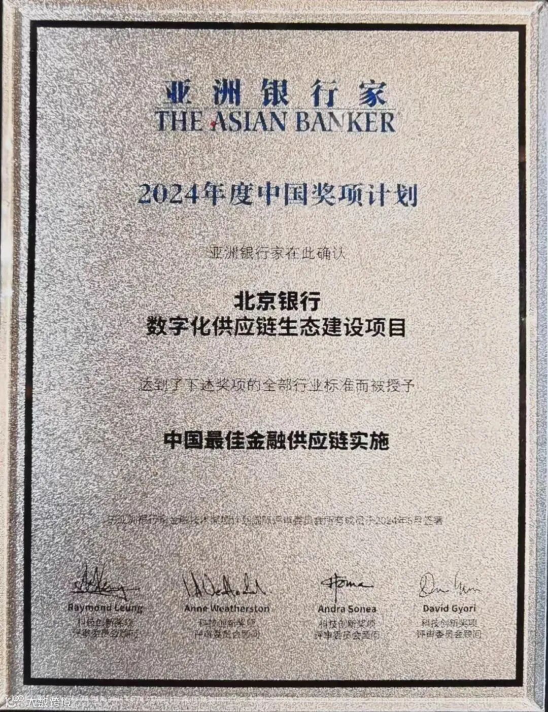 6月21日,由《亚洲银行家》主办的“2024中国未来金融峰会”在北京召开。北京银行凭借其卓越表现,荣获2024年度交易金融奖项计划中的“中国最佳金融供应链实施奖项”。该奖项由全球知名银行家、行业顾问和业界领袖担任评审委员,基于严格的评分卡机制,对申报项目进行多维度评估后评定。