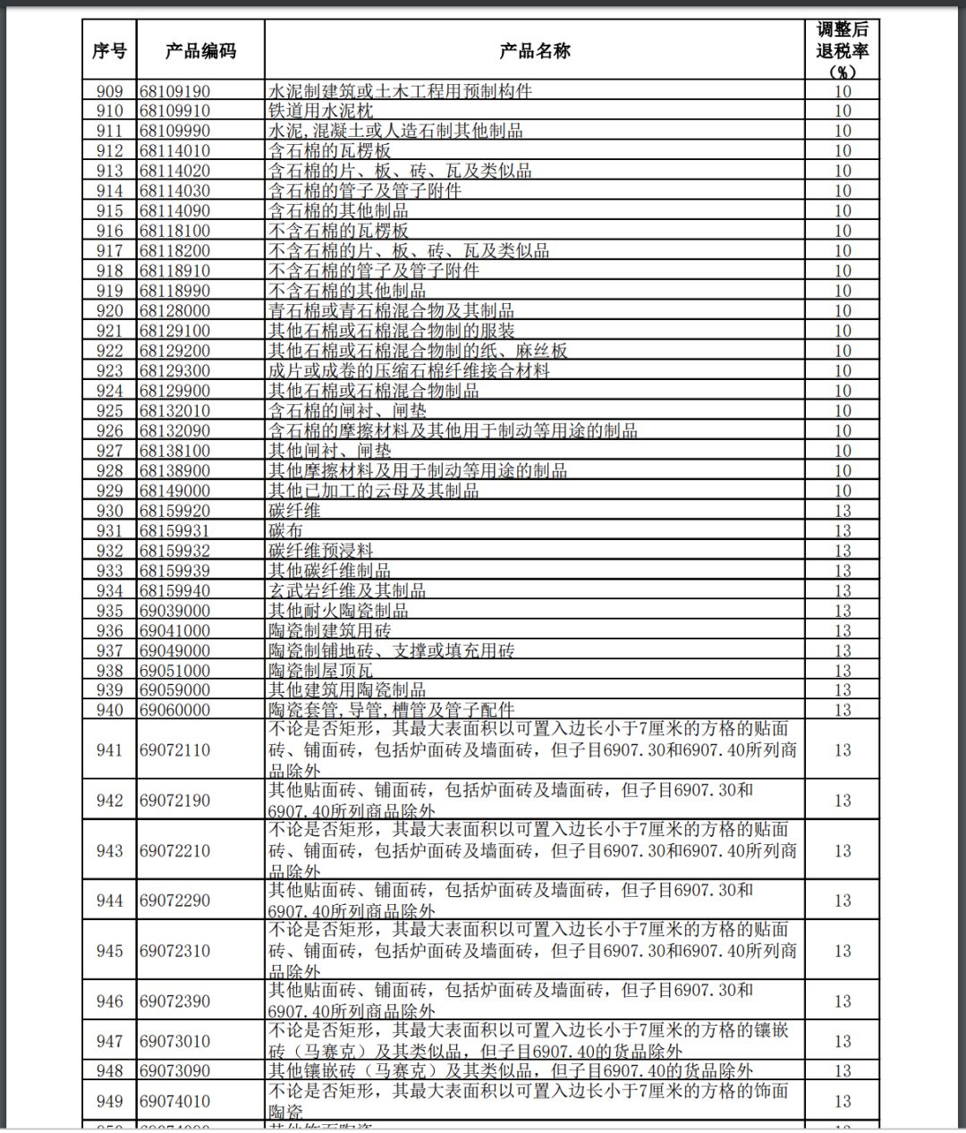 通知明确,将相纸胶卷、塑料制品、竹地板、草藤编织品、钢化安全玻璃、灯具等产品出口退税率提高至16%。将润滑剂、航空器用轮胎、碳纤维、部分金属制品等产品出口退税率提高至13%。将部分农产品、砖、瓦、玻璃纤维等产品出口退税率提高至10%。