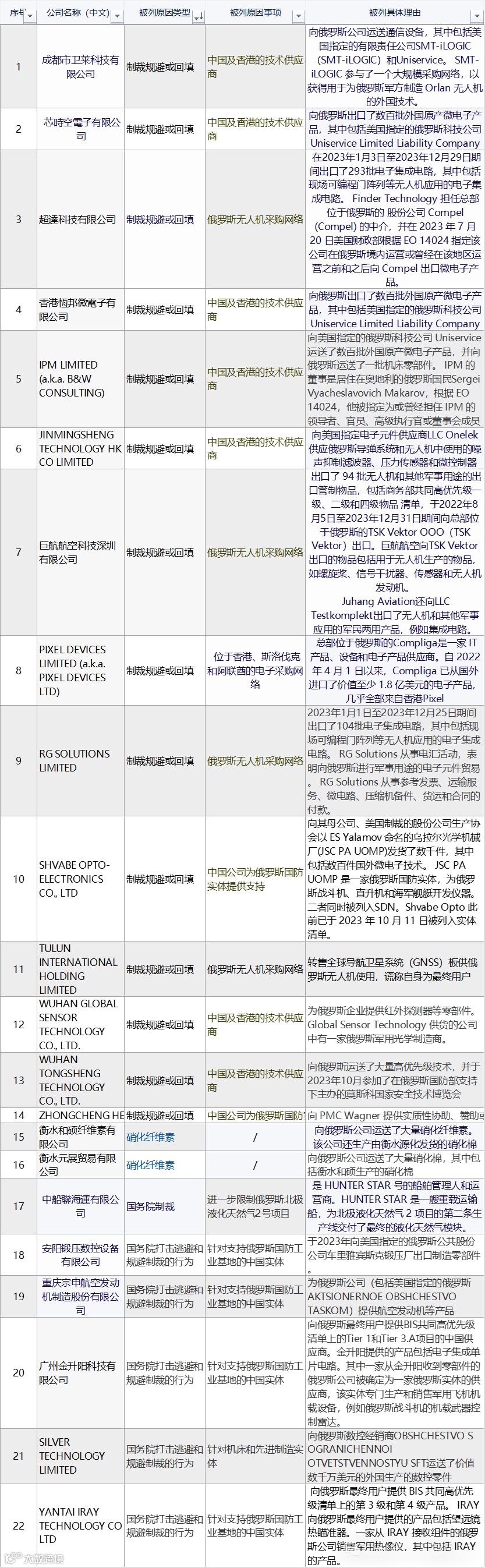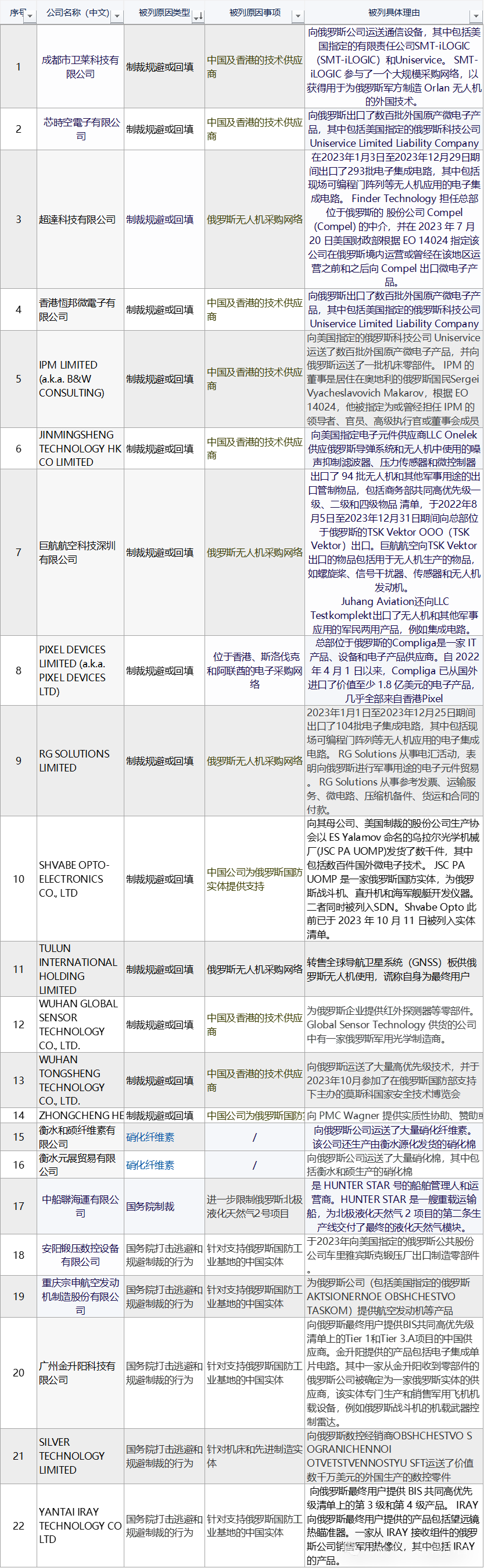 共有22家中国(含香港)企业被制裁。其中,国务院制裁了6家;财政部制裁了16家。被列原因包括帮助俄罗斯规避制裁、向俄销售硝化纤维素、为俄罗斯国防工业实体提供支持、向其销售机床和先进制造产品以及支持俄罗斯北极液化天然气2号项目等。相关企业名单及被列原因具体参见下表。
