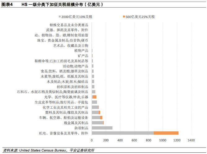 拟受影响的前十位中间产品和资本品分别是:电脑零件(150亿美元)、汽车零部件(90亿美元)、钢铁产品(80亿美元)、塑料(60亿美元)、电力变压器、静态变流器和电感器(50亿美元)和铝(7.94亿美元)。