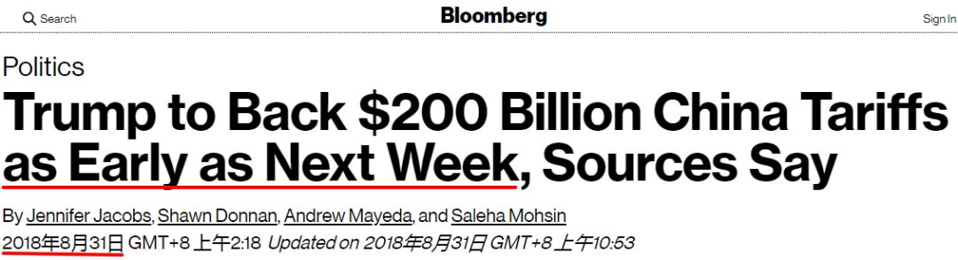 彭博社报道:消息称特朗普最早将在下周(也就是本周)对2000亿美元中国商品开征关税