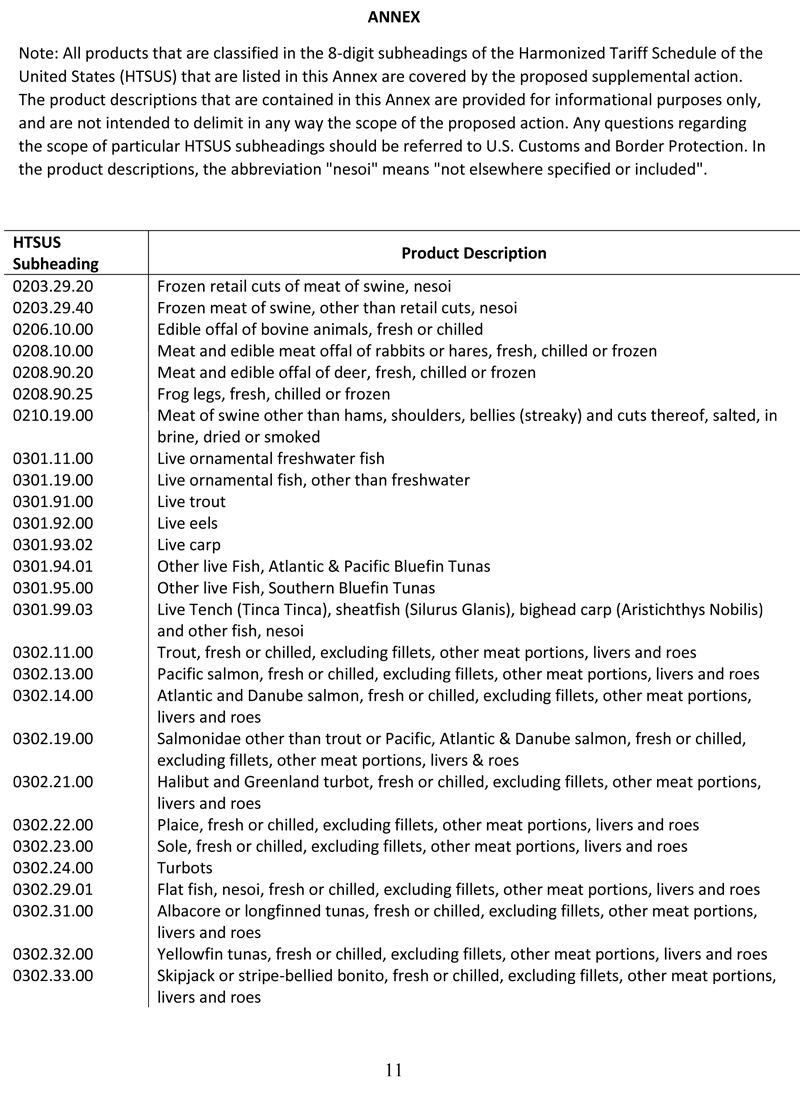 拟受影响的前十位消费品分别是:电话(240亿美元)、电脑(80亿美元)、家具(110亿美元)、椅子(100亿美元)、灯具(70亿美元)、旅行包(70亿美元)和农业及食品(60亿美元)。受影响的家庭用品包括真空吸尘器(18亿美元)、烹饪用具(38亿美元)和冰箱(10亿美元)。(括号内金额为2017年的贸易统计数据)