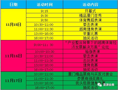 越南国际体育用品和运动时尚贸易博览会于今日在河内国际会展中心盛大开幕,展期为11月15日至18日,为期四天。越南体博会由越南社会主义共和国工贸部主办,由越南工贸部旗下的vinexad展览广告有限公司、荟源会展承办,是越南唯一的国家级专业体育用品展。