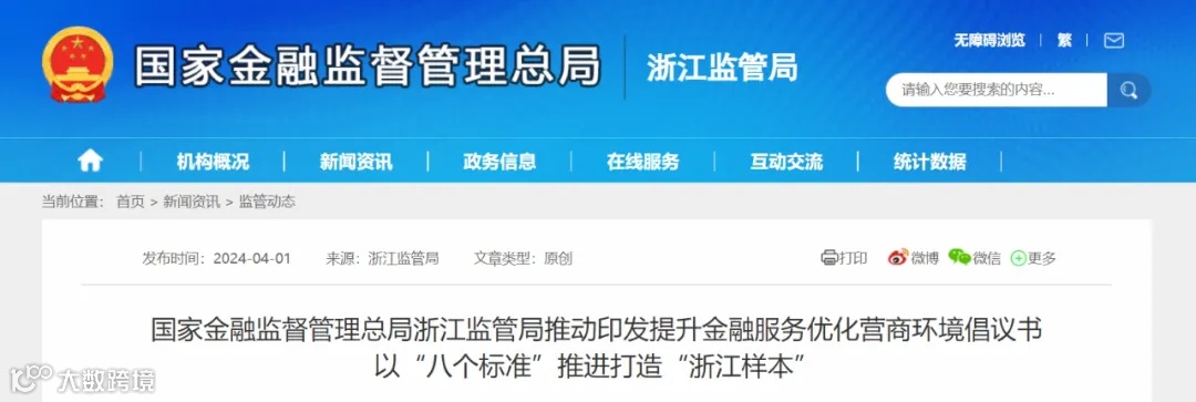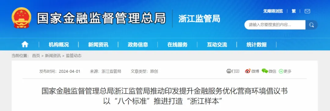 良好的金融服务体系是优化营商环境的重要力量。近日,国家金融监督管理总局浙江监管局深入贯彻党中央、国务院关于优化营商环境决策部署,落实浙江省营商环境“一号改革工程”、《浙江省营商环境优化提升条例》学习宣传贯彻等工作要求,指导省银行业协会、省保险行业协会联合印发《关于提升金融服务优化营商环境的倡议书》,围绕保障充分、供给适配、体验便捷、信息透明、质好价优、精准高效、对接畅通、规范安全等八个方面建立标准,打造金融服务环境“浙江样本”,助力浙江建设市场化、法治化、国际化的一流营商环境。