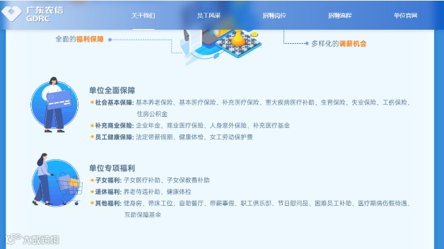 在薪酬福利方面,广东省农信联社不仅为员工提供“七险四金”的福利保障和健康保障,还有子女医疗补助、子女保教费补助、养老待遇补助等单位专项福利。
