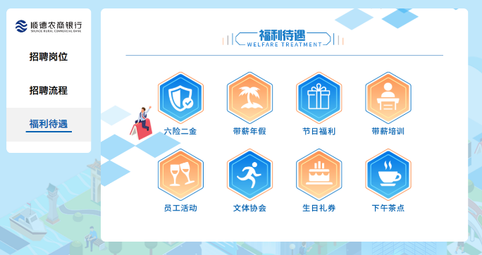 顺德农商银行春季校招金融科技类岗位包括总行数字科技定向生、金融菁英培训生等。为了招揽人才,该行将为员工提供“六险二金”带薪年假、生日礼券以及下午茶点等福利待遇。