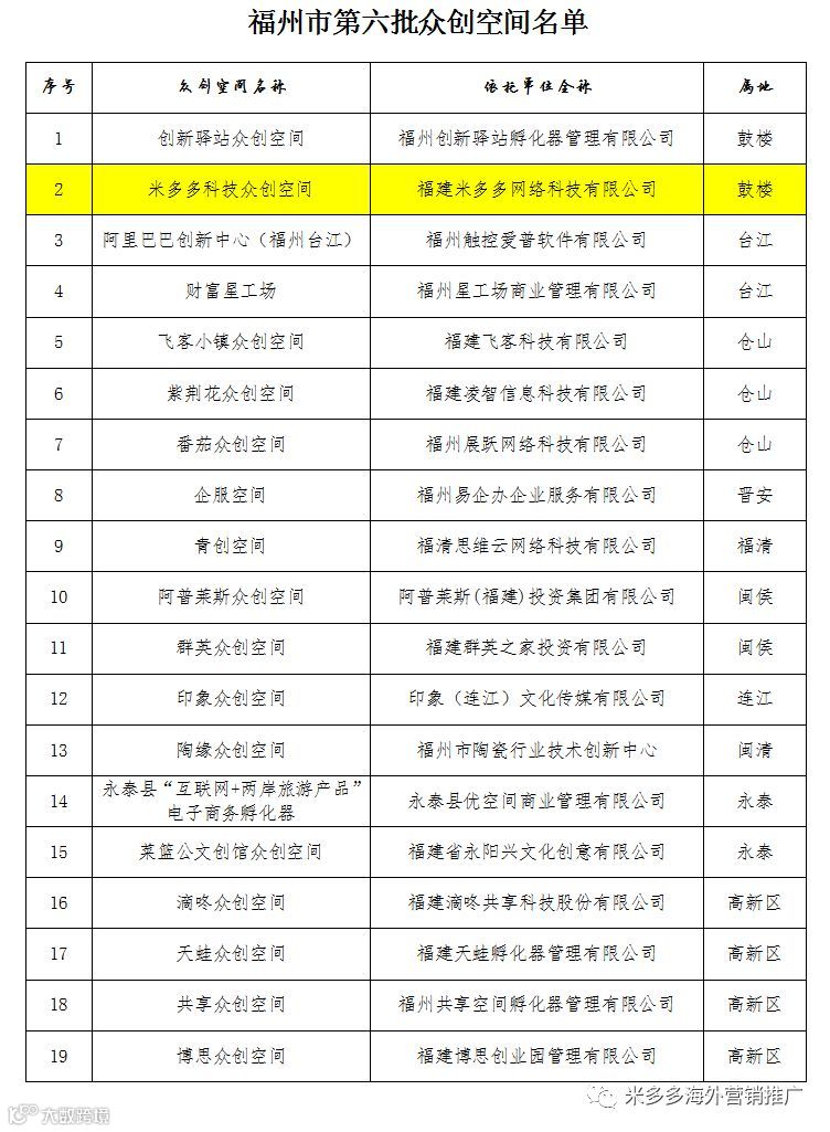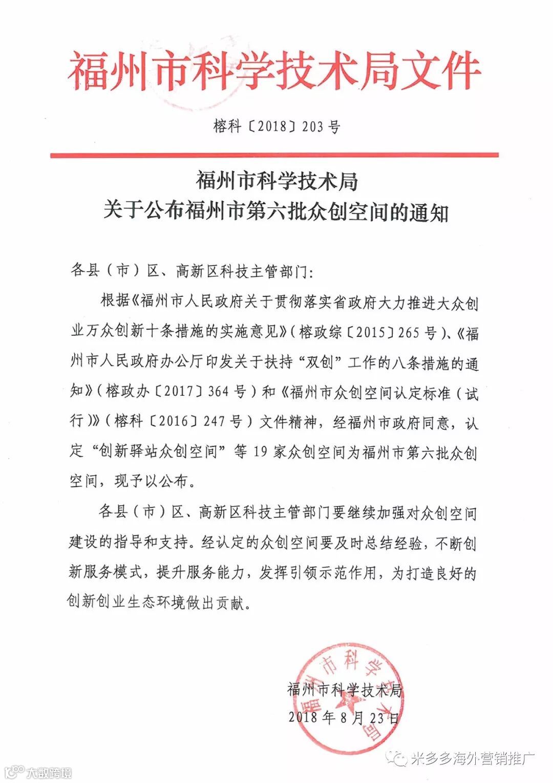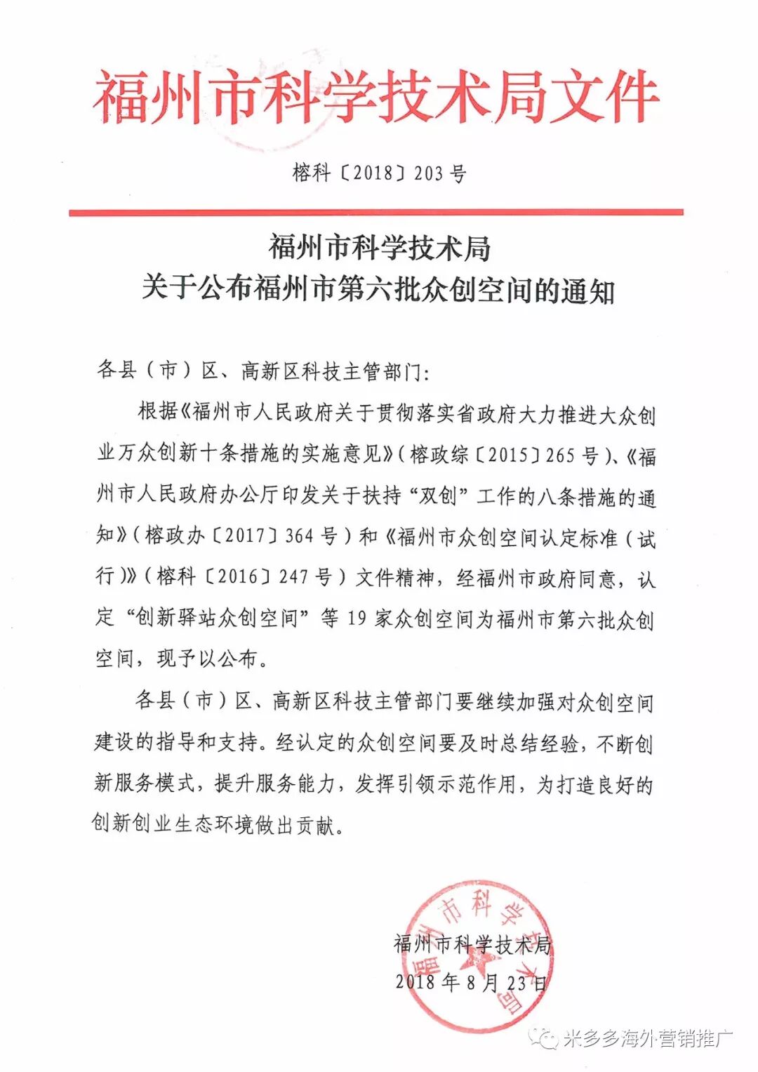 2018年8月23日,福州市科技局正式发文公布福州市第六批众创空间认定结果,米多多科技众创空间光荣在列,正式认定为市级众创空间!