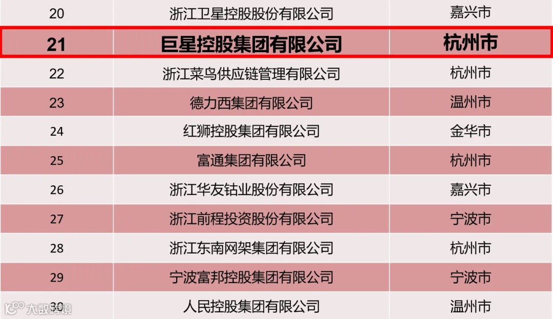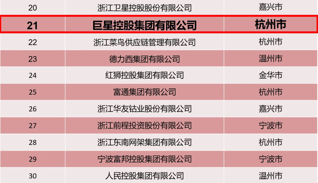11月14日,浙江省市场监督管理局、省工商业联合会公布“2023年度浙江省民营企业百强榜单”。其中,钱塘智慧城企业巨星控股集团有限公司位列榜单第21位。