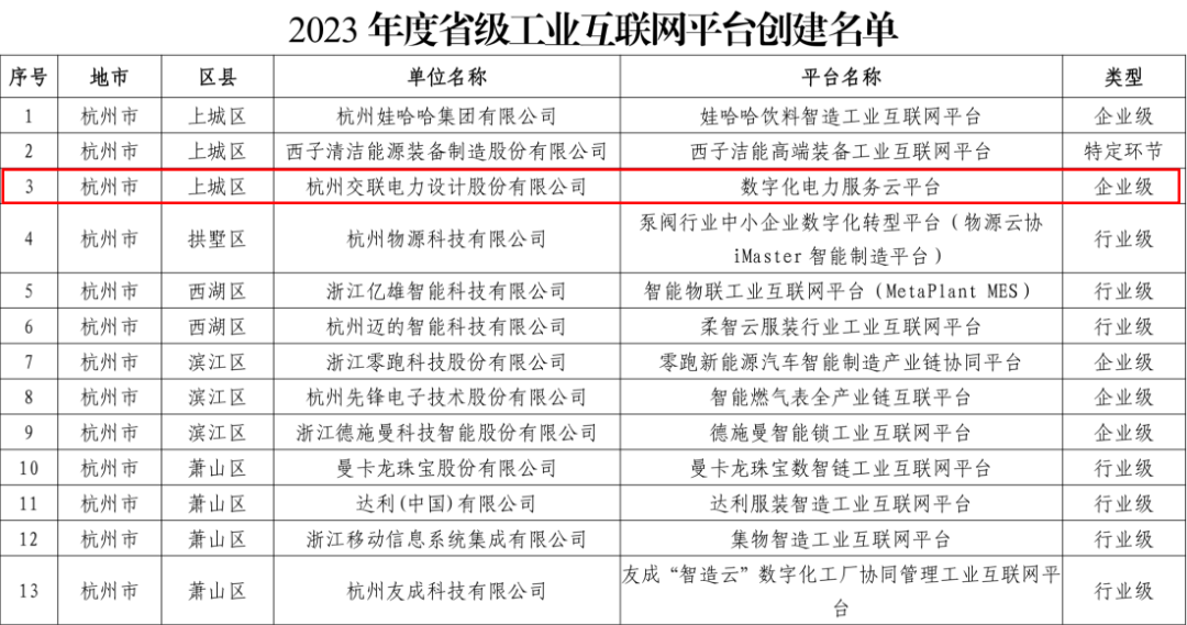 近日,浙江省经信厅公布2023年度省级工业互联网平台创建名单,钱塘智慧城企业杭州交联电力设计股份有限公司的数字化电力服务云平台成功入选,跻身“省级企业级工业互联网平台”创建行列。