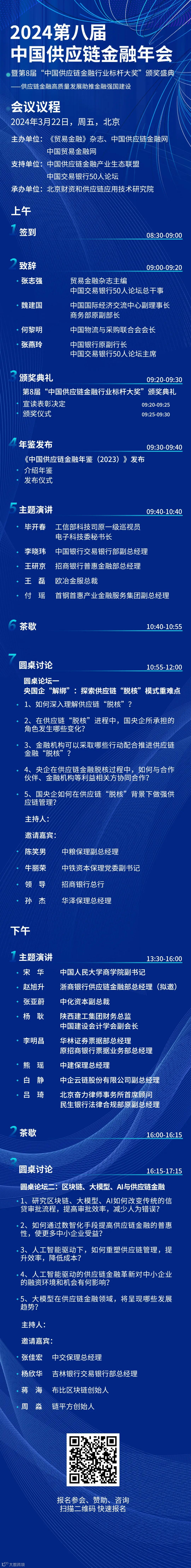 第八届中国供应链金融年会,汇聚行业精英,共探供应链金融新趋势、挑战与机遇,为行业发展注入新活力。深入交流前沿技术、创新模式及成功案例,发掘新机遇,助力产业繁荣与经济持续发展。诚邀您共襄盛举,共创供应链金融辉煌未来!
