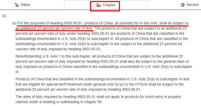在“Chapter”页面下我找到了这个note 20,它是对中国产品加税的一个解释。这里明确说明了,25%是额外征收的税率。下文中也继续列出了归在“9903.88.01”项下的编码。