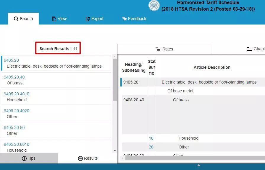 查询办法:进入上述网站,在Tariff Assistance项下Search the current Harmonized Tariff Schedule...下的搜索框中输入输入中国HS CODE的前六位数,如台灯940520****,搜索结果页面的左边框有详细的HTS CODE,根据自己的产品选择HTS CODE。