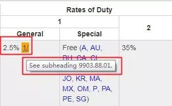 “1”中的“General”指从世界绝大部分进口产品的关税(含中国),“Special”指和美国有相关自贸协定国家的进口关税(经常有free的,可是那不是给我们享受的);