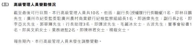 记者注意到,广州农商银行在2023年中期报告中曾披露,该行一位副行长的名字为郭华辉。记者以投资者身份采访了广州农商银行相关人士,对方表示,该行副行长郭华辉已离职。根据资料显示,郭华辉出生于1971年3月,毕业于中山大学,东北财经大学会计硕士,高级经济师,2022年4月起任广州农商银行副行长。