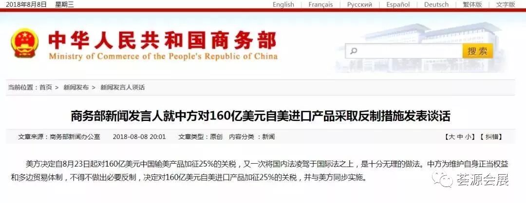 北京时间8月8日晚,中国商务部决定对160亿美元自美进口产品加征25%的关税,并与美方同步实施。