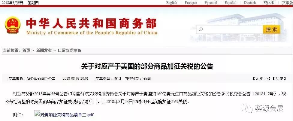 经国务院批准,国务院关税税则委员会决定对《国务院关税税则委员会关于对原产于美国500亿美元进口商品加征关税的公告》(税委会公告[2018]5号)中对美加征关税商品清单二的商品作适当调整后,自2018年8月23日12时01分起实施加征25%的关税。