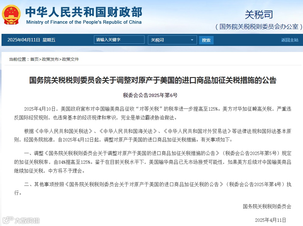 就在刚刚,国务院关税税则委员会公布公告调整对原产于美国的进口商品加征关税措施。自2025年4月12日起,对美加征关税税率由84%提高至125%。
