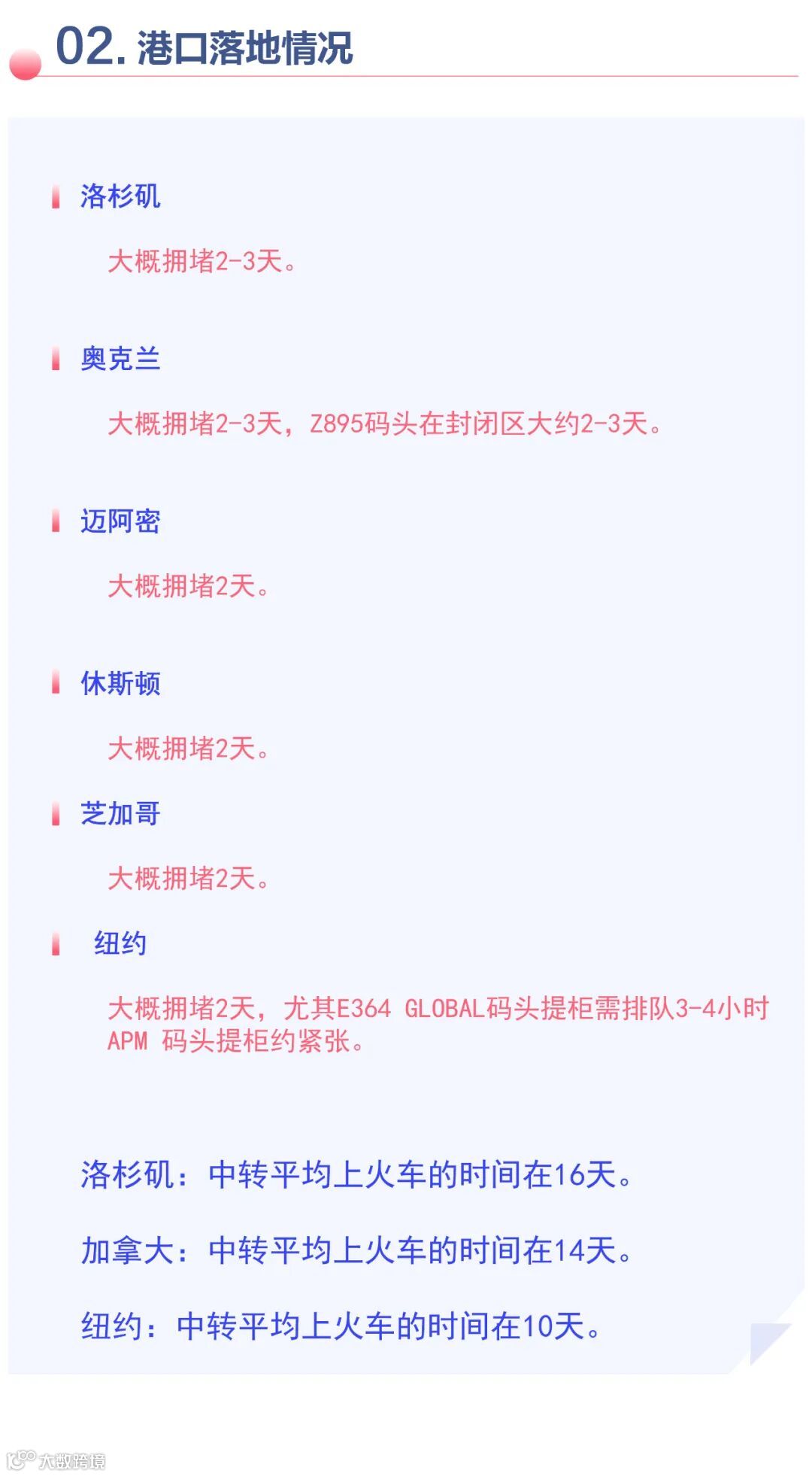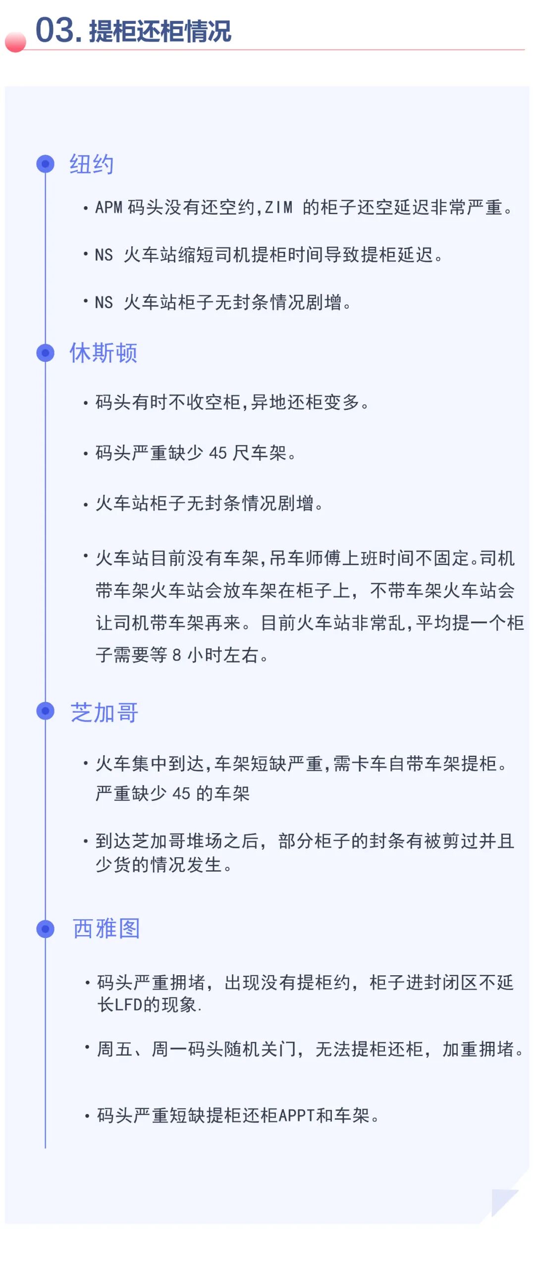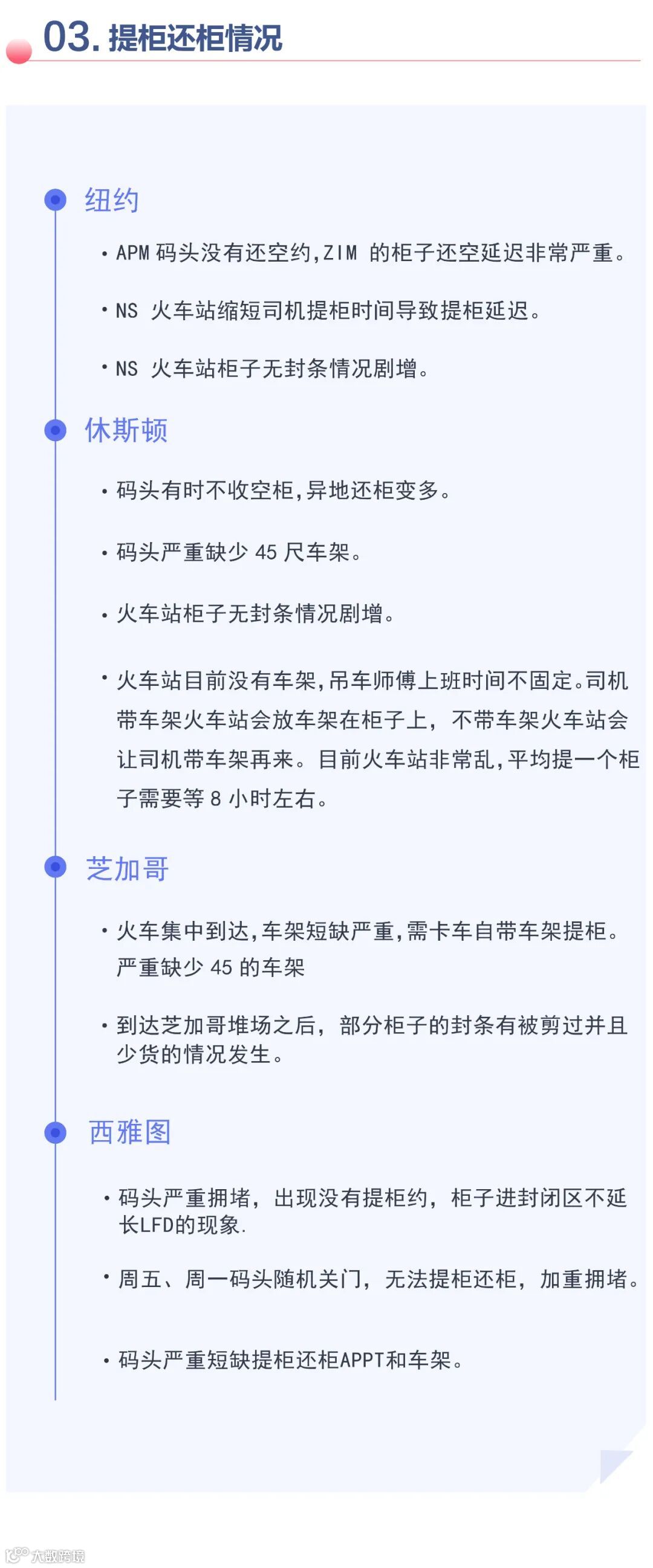全美火车站车架短缺,柜子积压严重,吊车师傅人手不足,吊柜效率低,司机的平均等待时间超过6个小时。