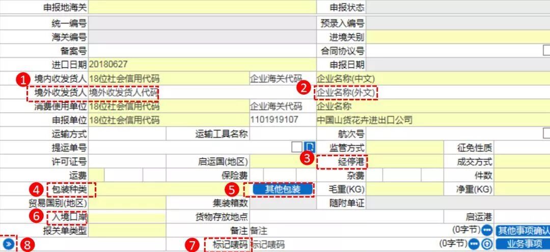 注意:黄色必填项,灰色自动返填项,白色选填项,如果非法检商品, ︾以下的检务项(包括黄色)可以不填写