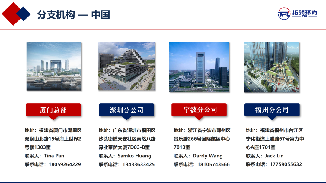 拓领环海供应链管理有限公司,成立于2016年6月,总部位于厦门,目前在深圳、宁波、福州、胡志明、巴生设有分公司。商务部批准的一级国际货运代理,交通部批准NVOCC。拓领环海专注于中国至北美的传统航运业务、跨境电商头程业务及美国海外仓服务。