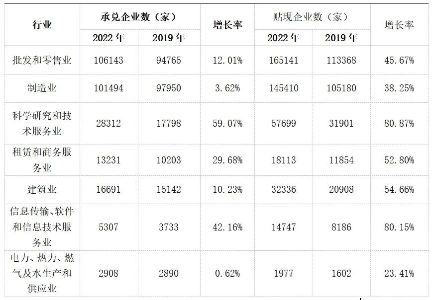 在统计是17个行业中,承兑企业数增长最多的是批发零售业,较2019年增加了1.1万家,增幅为12%;其次是科学研究和技术服务业,近三年增加了1万余家,增幅达59%;承兑企业减少最多的行业是房地产业,三年来减少了434家,减幅为4%;变化率最高的行业是卫生和社会工作业,由2019年的3家企业,到2022年的37家企业开展承兑业务,增长了11倍。贴现企业数增长最多的还是批发零售业,近三年增加了5万余家,增幅达45.67%;贴现企业数减少最多的是农林牧渔业,减少了1218家,减幅为34%;变化率最大的行业是文化、体育和娱乐业,从2019年的48家企业参与贴现,增长到2022年的299家,增幅为523%。