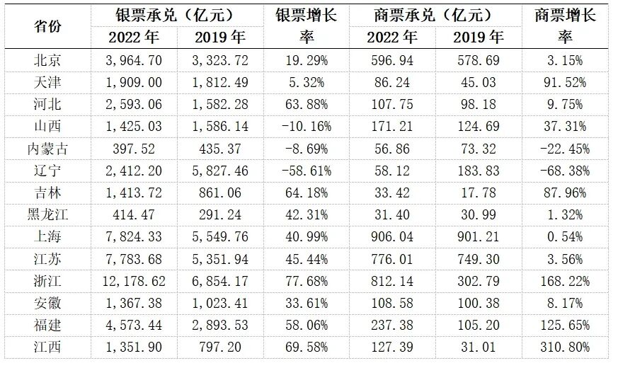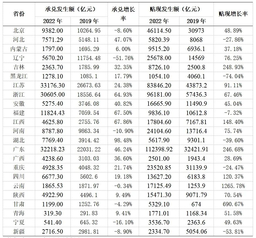 表1-2 2019年和2022年各省市承兑、贴现发生额情况