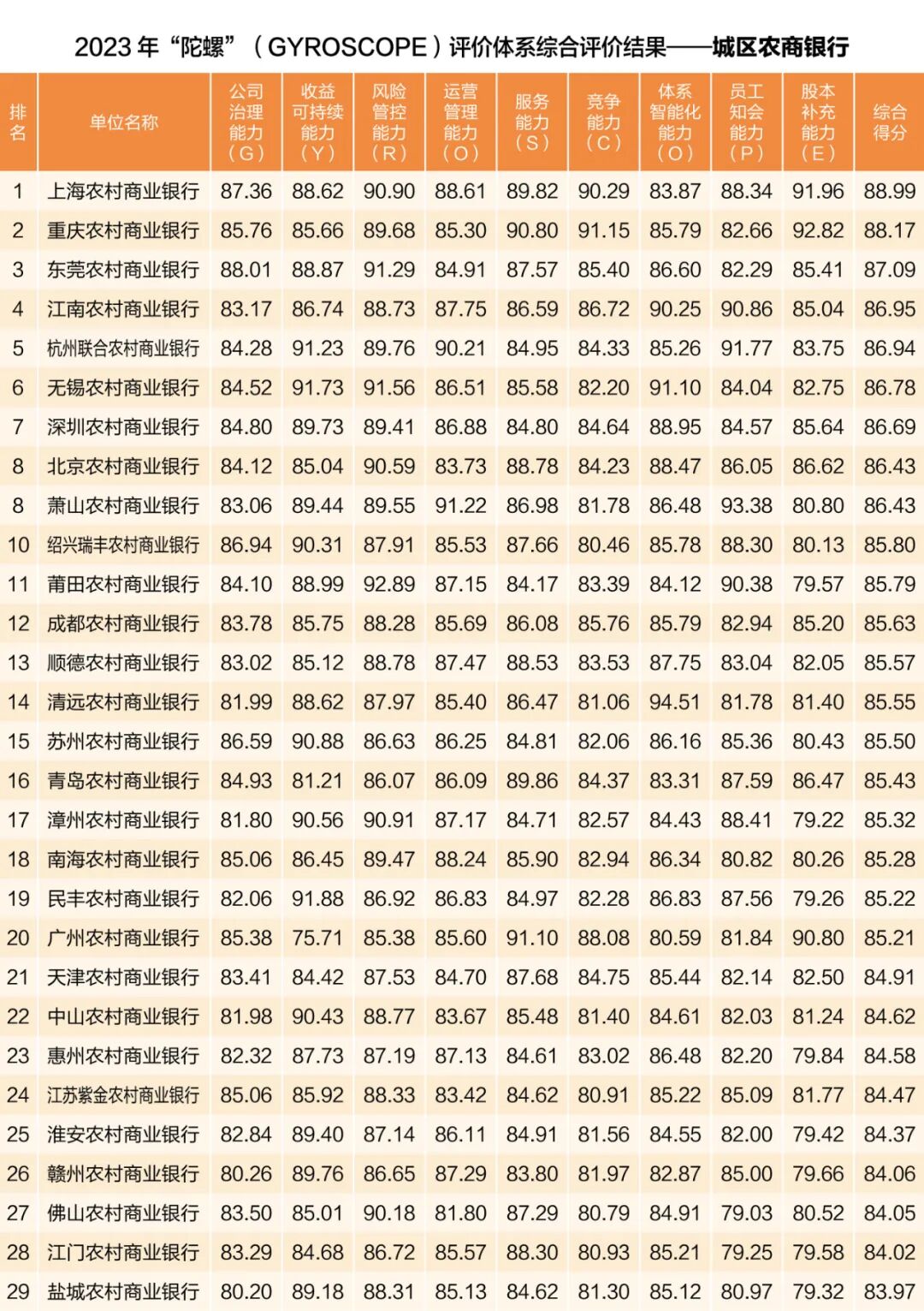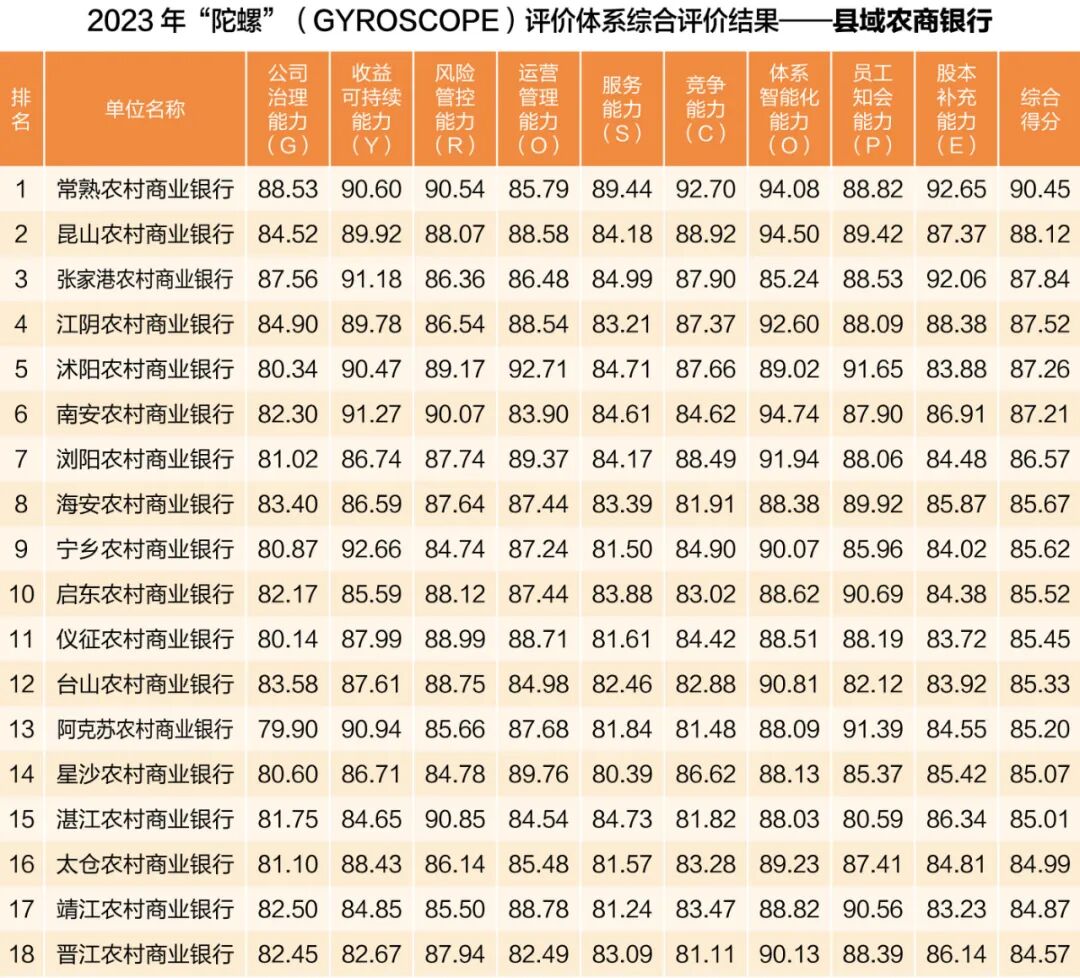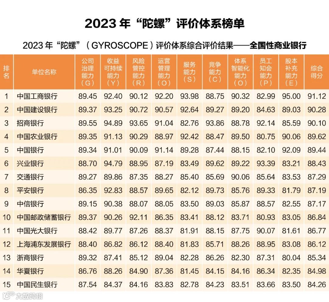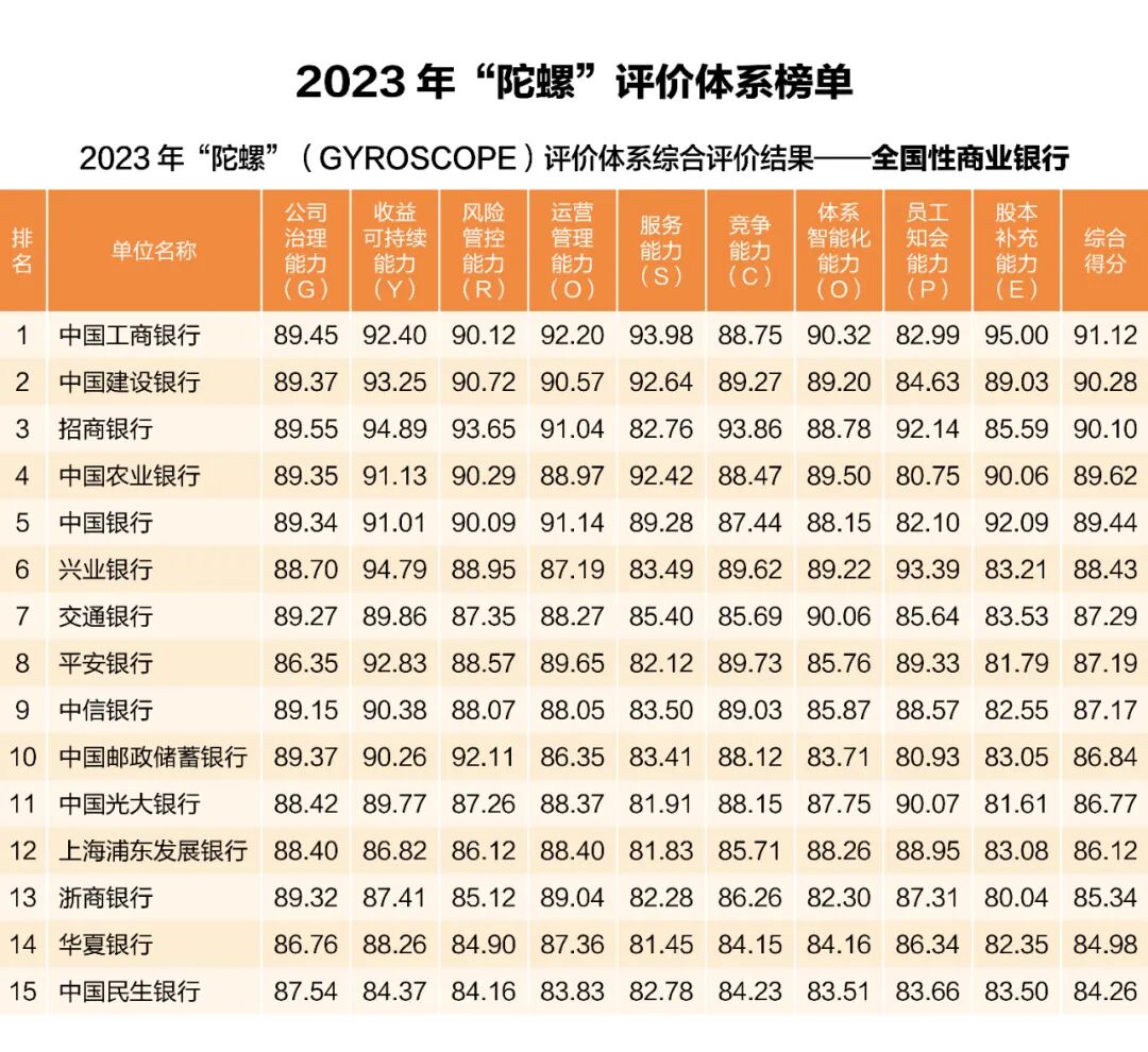 近期,中国银行业协会行业发展研究专业委员会发布了2023年“陀螺”(GYROSCOPE)评价结果。该评价指标体系通过公司治理能力(G)、收益可持续能力(Y)、风险管控能力(R)、运营管理能力(O)、服务能力(S)、竞争能力(C)、体系智能化能力(O)、员工知会能力(P)、股本补充能力(E)九个维度对商业银行稳健发展能力进行综合评价。评价结果包括“1+9”主、副榜单,主榜单为综合评价榜单,副榜单为九个维度评价榜单。