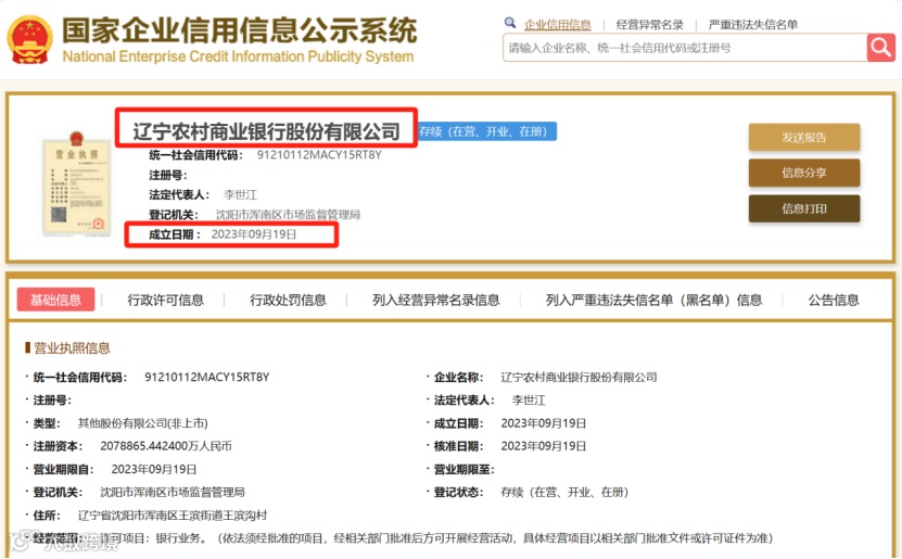 9月22日,国家企业信用信息公示系统官网显示,辽宁农商行于9月19日成立,注册资本为207.89亿元,登记机关为沈阳市浑南区市场监督管理局,经营范围为银行业务。