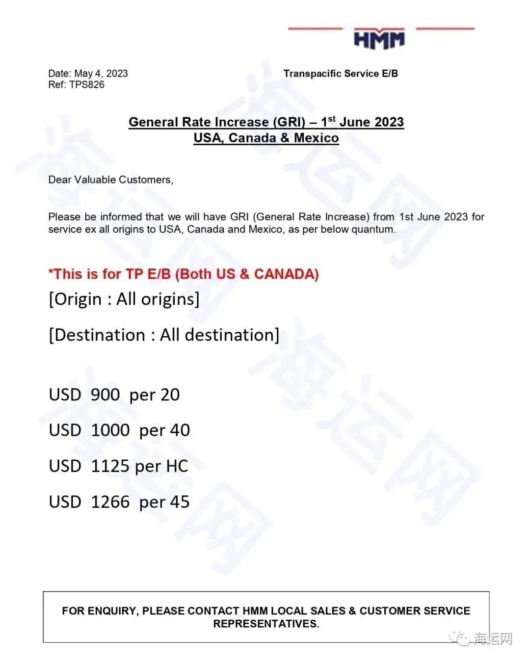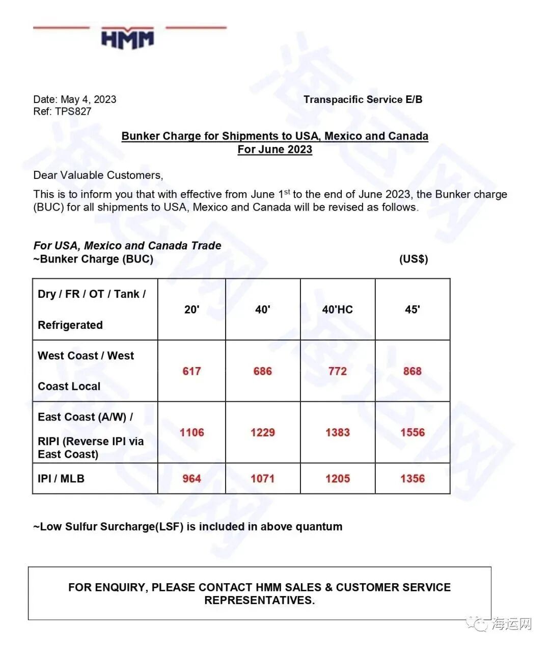 HMM 从6月1日起将对所有始发港到美国、加拿大和墨西哥的服务(跨太平洋东行航线)上调综合费率上涨附加费(GRI)。并自2023年6月1日至6月底,所有发往美国、墨西哥和加拿大的货物的燃油附加费(BUC)也将有所调整。