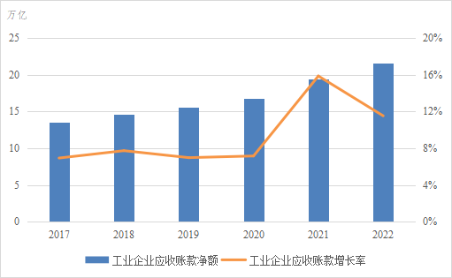近年来,应收账款高企愈发成为制约企业尤其是中小微企业发展的重要因素。国家统计局数据显示,2022年我国工业企业应收账款净额已达到21.65万亿元,较2017年增加8.09万亿,年均增速达到8.09%,2021年甚至达到了15.88%的高速增长水平,应收账款淤积现象严重。