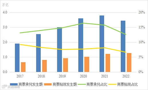 近年来,随着票据市场发展,商票业务体量有所提升,然而市场份额并无明显变化,商票承兑、贴现分别维持在15%、7%左右的市场占比。2022年,受部分低信用企业违约事件冲击,叠加经济下行压力、类票据发展等因素影响,市场参与主体对商票接受度有所下降,商票承兑发生额仅有3.93万亿,同比下降9.72%,承兑占比回落至12.58%;商票贴现发生额1.28万亿,同比增长4.81%,市场占比仅有6.63%,创下了7年以来的最低点。