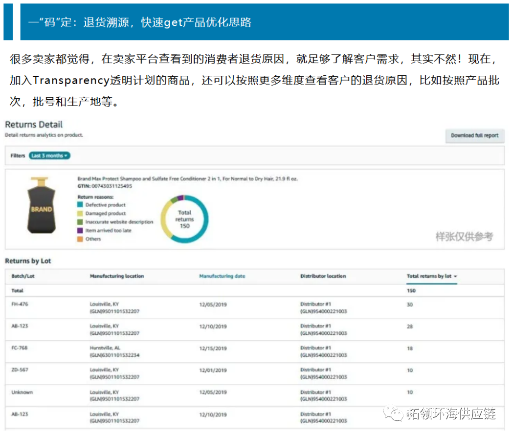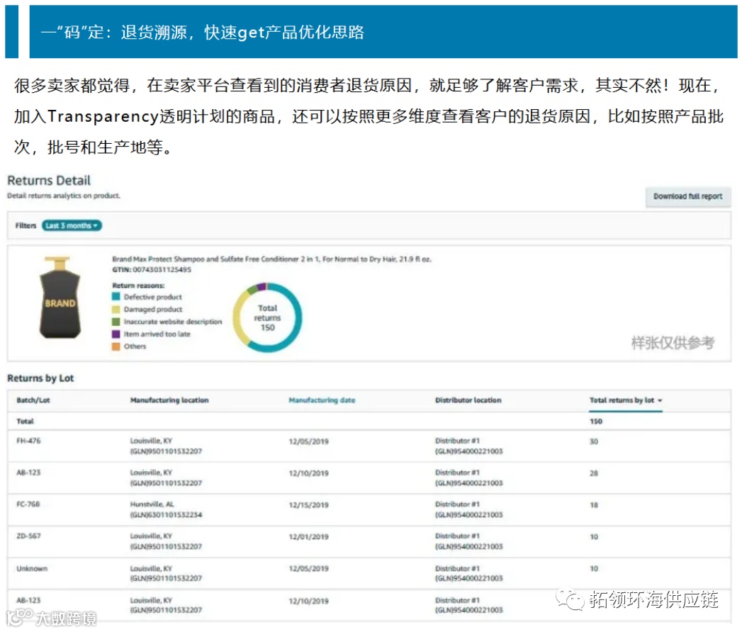简化追踪:已加入Transparency透明计划的商品,不管该品牌的商品在亚马逊上由谁销售,品牌都可在一个界面,统一查看该商品全部的退货信息。