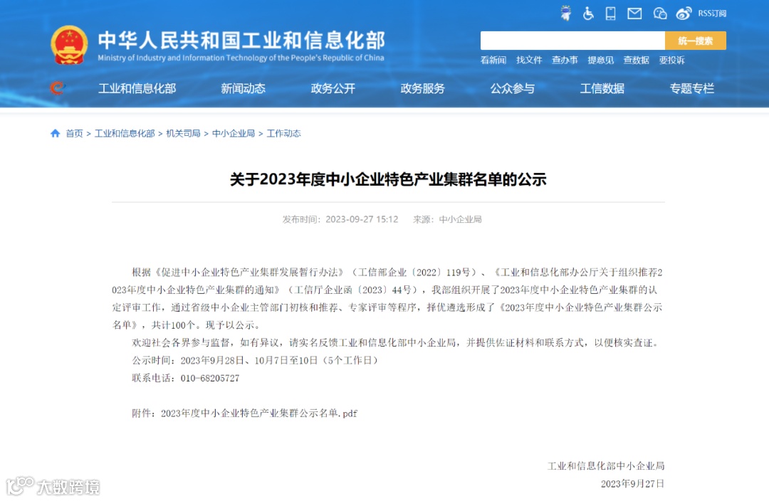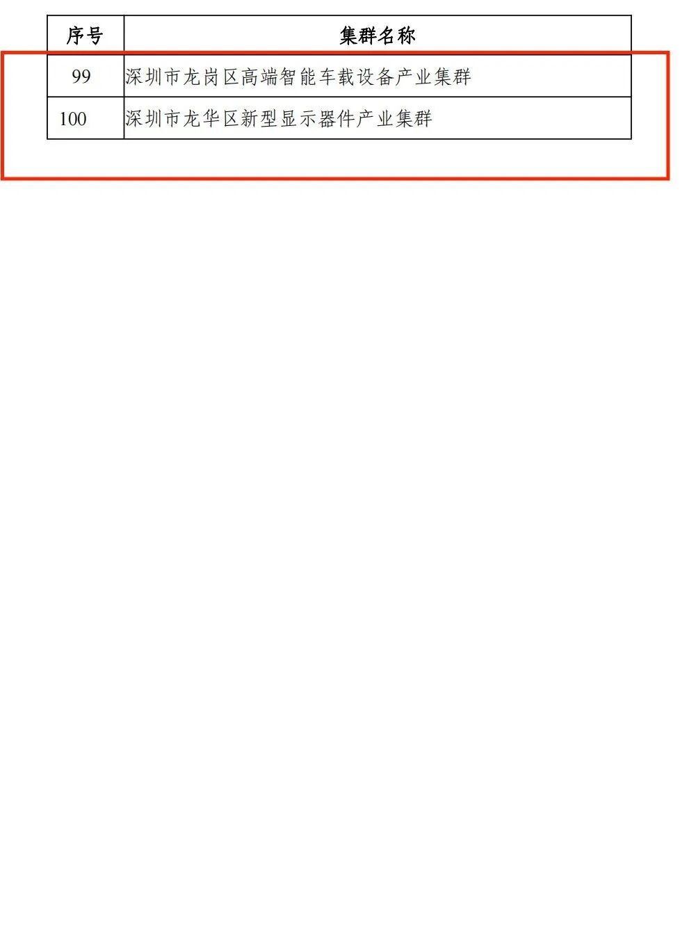 近日,国家工业和信息化部中小企业局组织开展了2023年度中小企业特色产业集群的认定评审工作,通过省级中小企业主管部门初核和推荐、专家评审等程序,择优遴选形成了《2023年度中小企业特色产业集群公示名单》,共计100个。深圳市龙华区新型显示器件产业集群、深圳市龙岗区高端智能车载设备产业集群等入选。