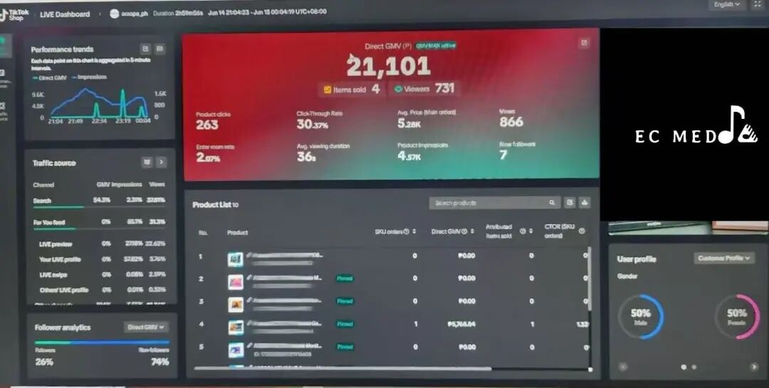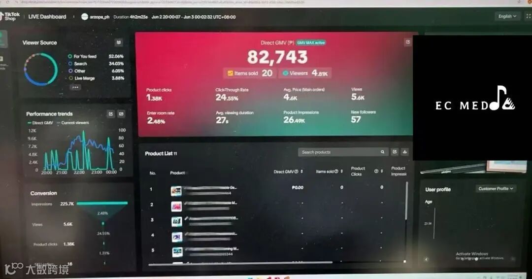 如上图一中"Viewer Source":自然流量(For You Feed)占比52.06%;如上图二中显示自然流量观看占比(Views)85.1%;如上图三中产品点击率(Click Through Rate)20.66%;这些数据说明了菲律宾TikTok直播的自然流量占绝对主导(52.06%-85.1%),高流量+高点击(20.66%)验证了用户兴趣。