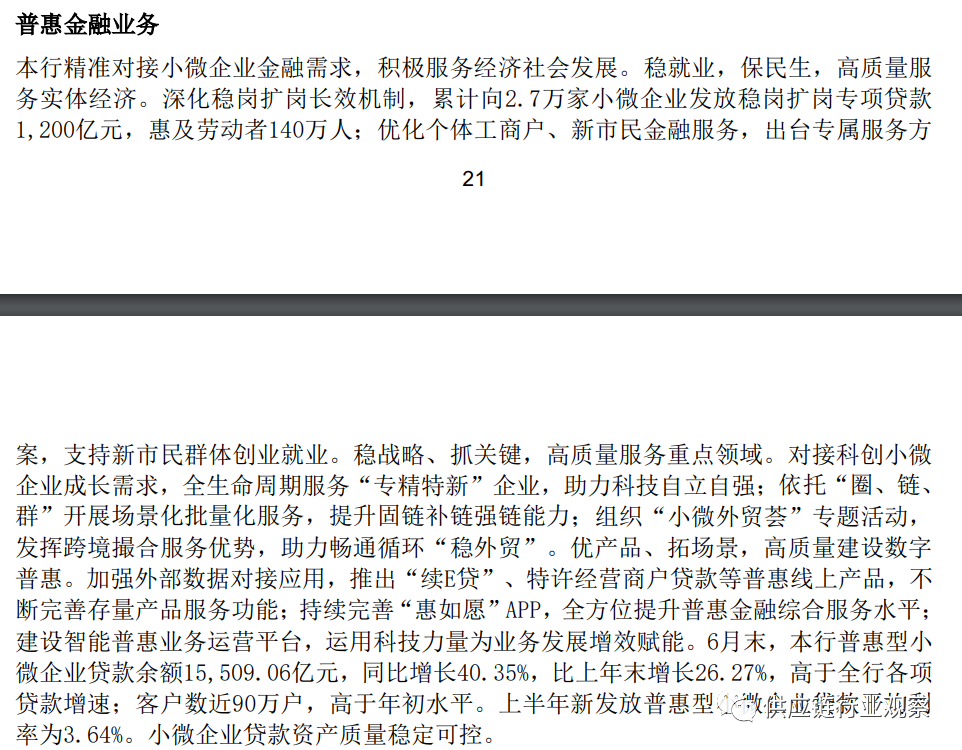 普惠金融方面,渤海银行重点聚焦两区(社区、园区)、两链(供应链、产业链)及生态客群,不断完善产品、市场及定价策略,进一步强化人员组织、流程优化、风险管理、系统建设等。