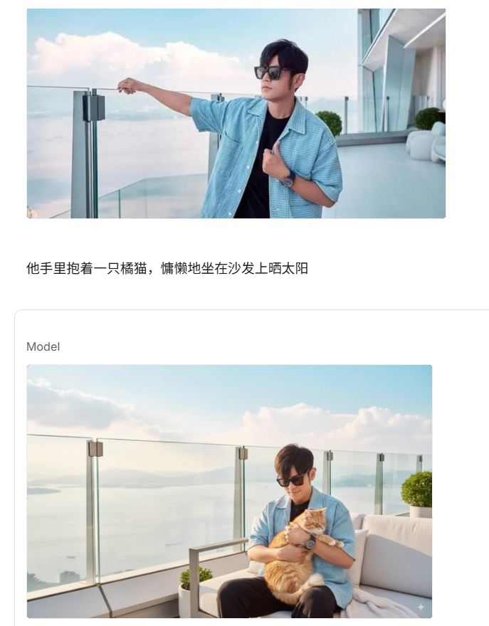在保持场景不变的前提下,你可以让AI生成人物的正视视角,或者让原本坐着的人站起来,它的细节处理得非常完美,连光影和影子都会跟着变化。