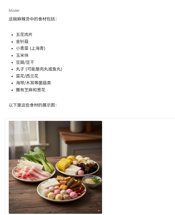 它可以将一碗麻辣烫的所有食材都识别并挑出来,还能生成这些食材的展示图。这种“细节识别”能力,为我们未来的内容创作提供了无限的可能。