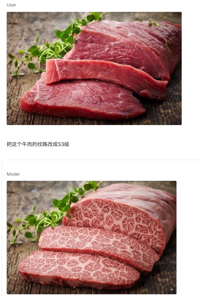 给它一张普通牛排的照片,让它把纹路改为S3级别,再让AI把牛排煎好摆盘,背景换成高级餐厅。这个功能对餐饮主理人来说,能瞬间提升产品的高级感,促进销量。