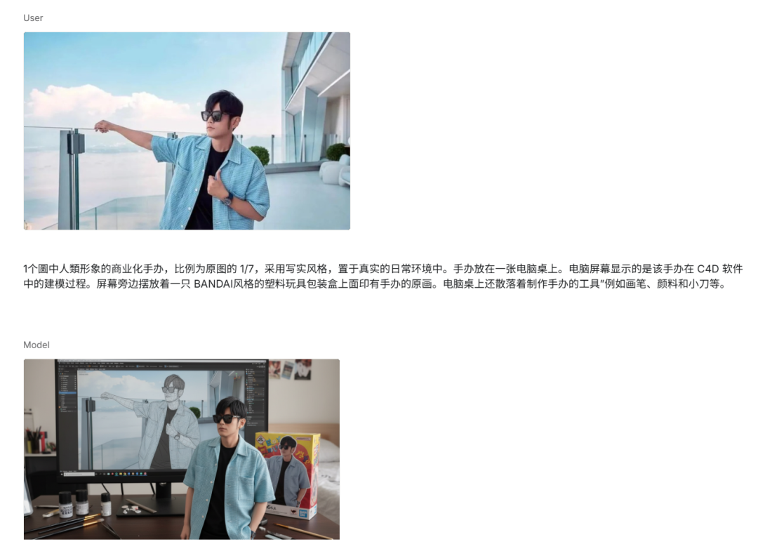你可以给AI一张照片,让它生成高写实度的手办效果图,连建模软件、包装盒等细节都处理得非常到位。