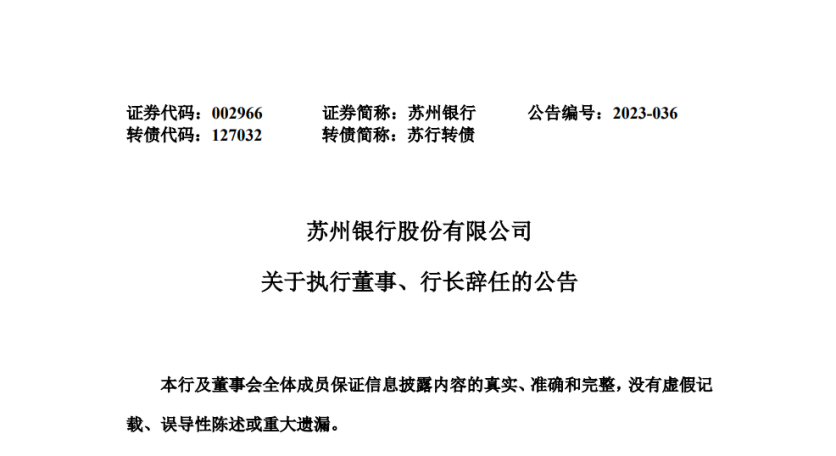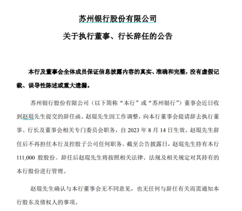 8月14日,苏州银行发布公告称,该行董事会近日收到赵琨提交的辞任函。公告显示,赵琨因工作调整,向本行董事会提请辞去执行董事、行长及董事会相关专门委员会职务,自2023年8月14日生效,赵琨辞任后不再担任本行及控股子公司任何职务。