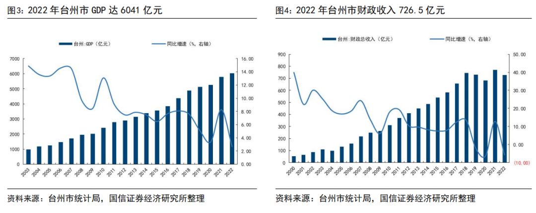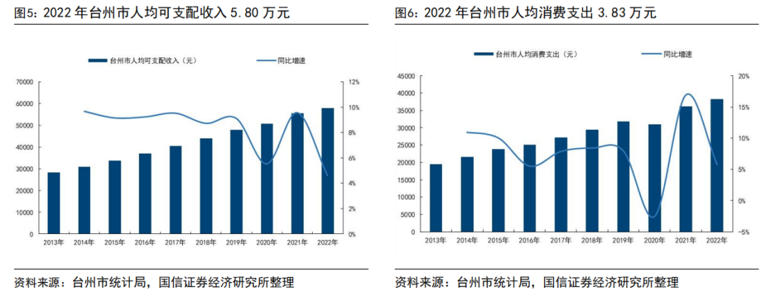 台州是浙江省下辖地级市,位于浙江沿海中部,濒东海,邻温州,区域经济发达。台州市多年来GDP保持高增长,2022年全年GDP达6041亿元。2021年台州市财政收入770亿元,同比增长12.8%,2022年疫情冲击下政府加大出台减税免税政策,台州市财政收入下降至727亿元。2022年台州市人均可支配收入为5.80万元,人均消费支出为3.83万元,均处在较好水平。
