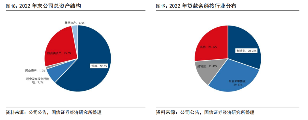 2022年末公司资产结构:贷款占62.1%,投资类资产占25.9%,同业资产占1.3%,现金及存放中央银行款项占7.7%,其他资产占3.0%。其中,贷款主要集中在小微企业聚焦的制造业、批发和零售业、建筑业三大产业,2022年末三大行业合计占全部贷款比例为73.68%。