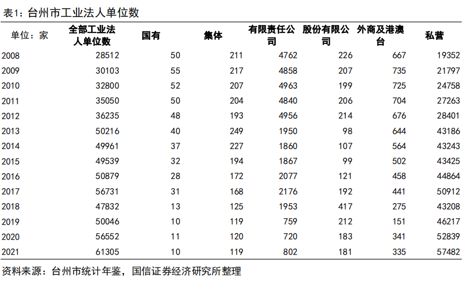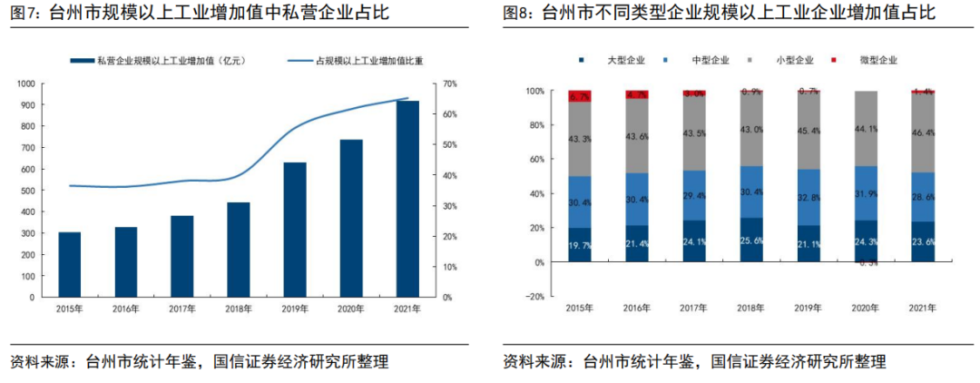 台州市经济发达,已成为中国民营经济发展的鲜活样本。2021年末台州市私营企业法人单位5.75万家,占全部工业法人单位数的93.8%;规模以上私营工业企业增加值占65.2%,中小微企业工业增加值占76.4%。活跃的民营经济培育出了泰隆银行、台州银行以及民泰银行等一批优质小微银行。
