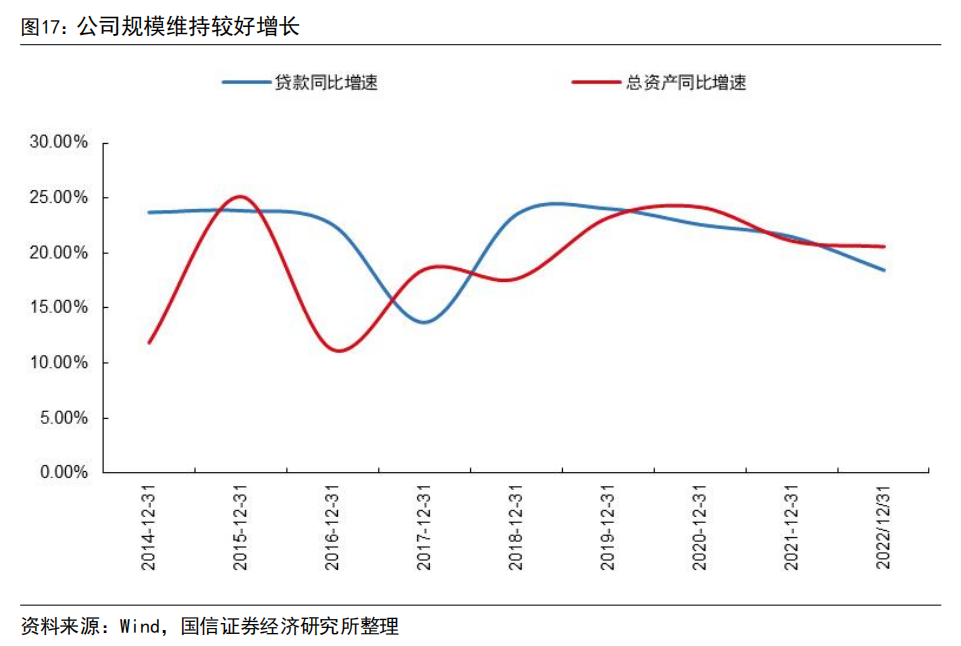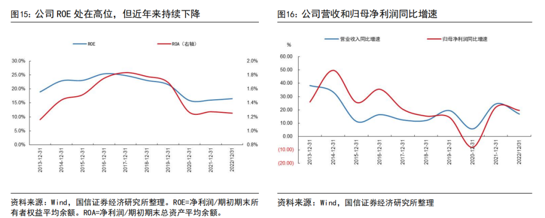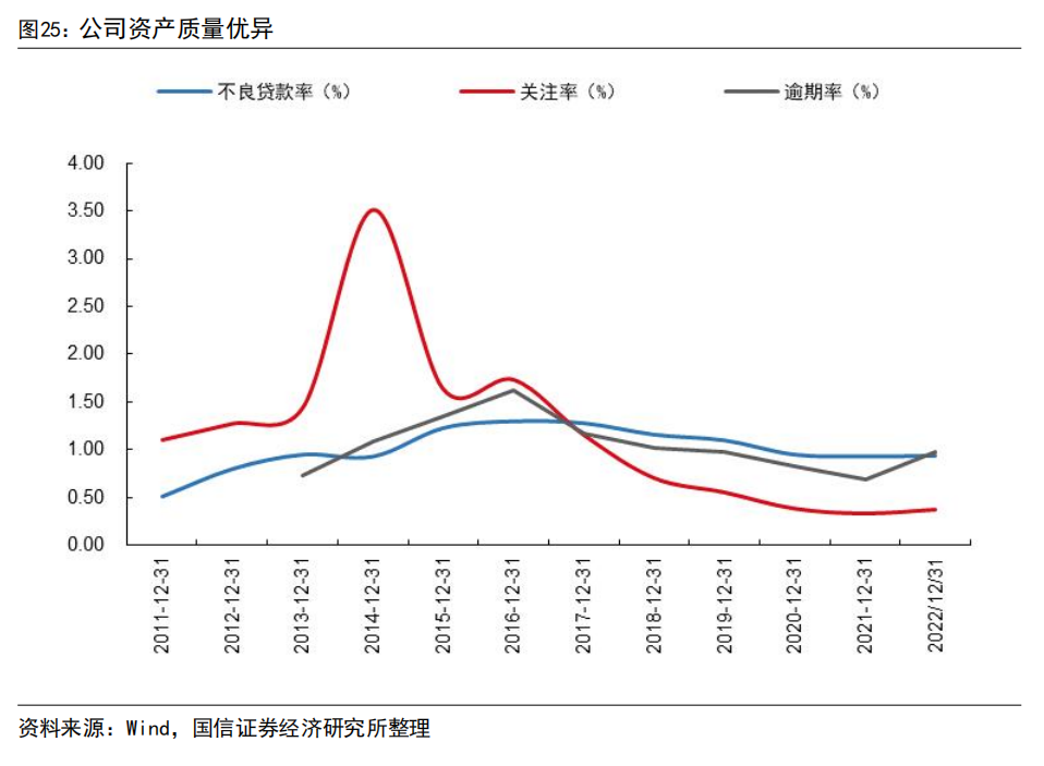 2020年以来公司盈利能力有所下滑,但仍处在较好水平。2020年受经济下行冲击,公司归母净利润负增,但2021年和2022年已恢复稳定较好增长。测算的2022年公司ROE为16.5%,ROA为1.25%,较2019年分别下降了5.0个和0.4个百分点。公司盈利能力下滑主要是2020年以来我国经济面临较大的下行压力,政策持续引导金融机构让利实体经济,公司积极响应政策要求大力度下调小微贷款利率,带来净息差大幅收窄。