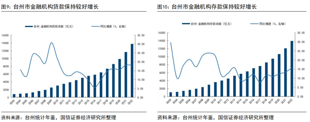 台州市经济繁荣,金融服务需求旺盛。2022年末台州市金融机构贷款余额1.38万亿元,同比增长18.0%;期末金融机构存款余额1.39万亿元,同比增长15.7%,存贷款多年来持续保持较好增长。