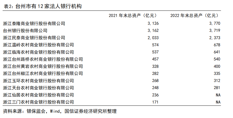 台州活跃的民营经济和旺盛的金融服务需求培育出了一批优质的小微银行。截至2022年末,台州市有12家法人银行机构(不包括村镇银行),包括3家城商行和9家农商行。其中,泰隆银行、台州银行和民泰银行已发展成为全国优质小微银行典范,2022年末总资产分别为3770亿元、3719亿元和2373亿元。根据Wind披露的341家城农商行总资产数据,三家银行分别排在了第55名、56名和77名,彰显了三家银行对小微企业的支持力度。