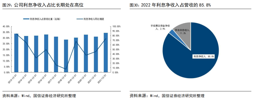 近年来公司净息差收窄,但规模扩张较快,因此净利息收入仍实现了较好增长。净利息收入占营收比重长期以来处在高位,2022年净利息收入占营收的85.8%,手续费及佣金净收入占2.9%,其他非息收入占11.3%。手续费及佣金净收入占比较低,一方面是因为过去小微企业客户大多自身业务简单,金融服务需求也很简单,不太会用到一些银行服务,另一方面也是泰隆银行长期为小微企业让利,很多日常中间业务均免费提供。
