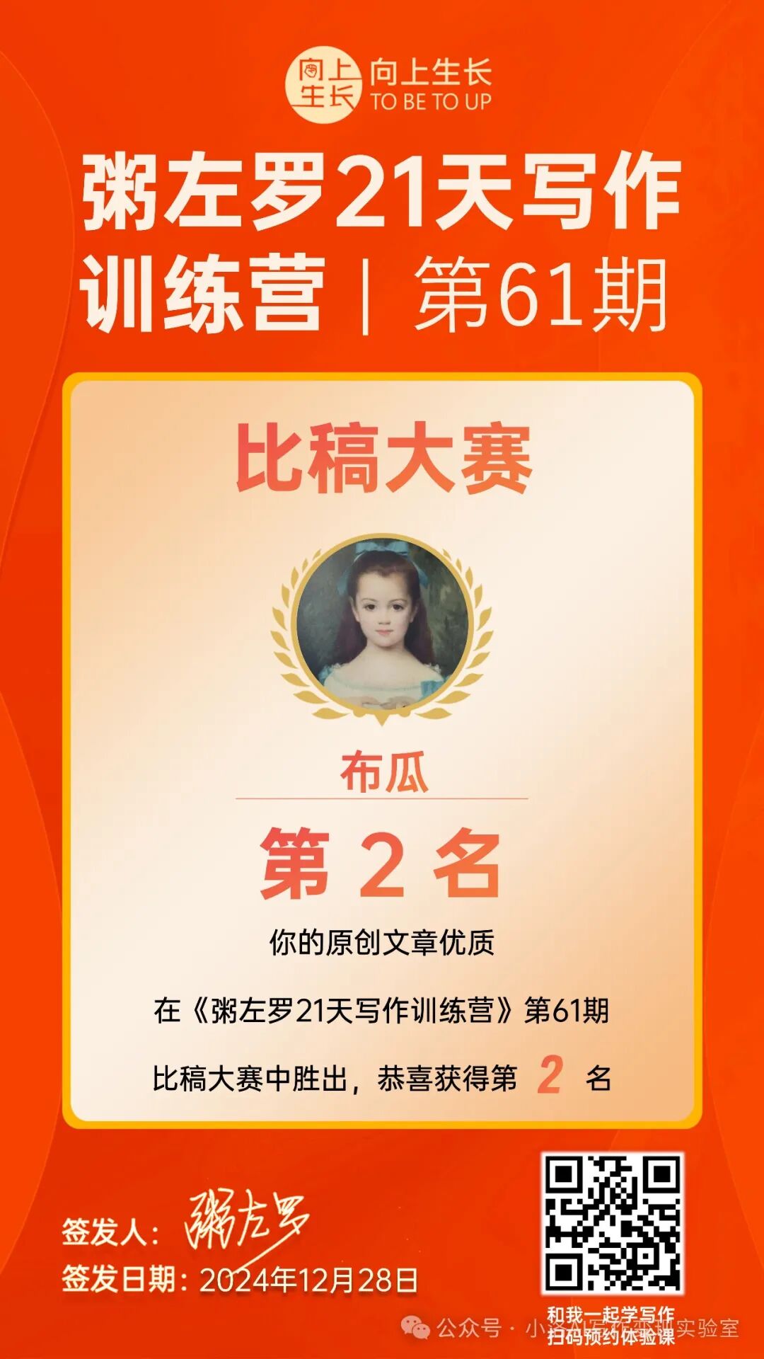 12月,我参加了粥左罗老师的21天写作训练营。这对我来说是一次大胆的尝试,因为我从未认真写过长文。最开始的几天,我甚至觉得自己的文笔根本无法和其他学员相比。但出乎意料的是,我不仅在比赛中入选,还拿到了第二名!